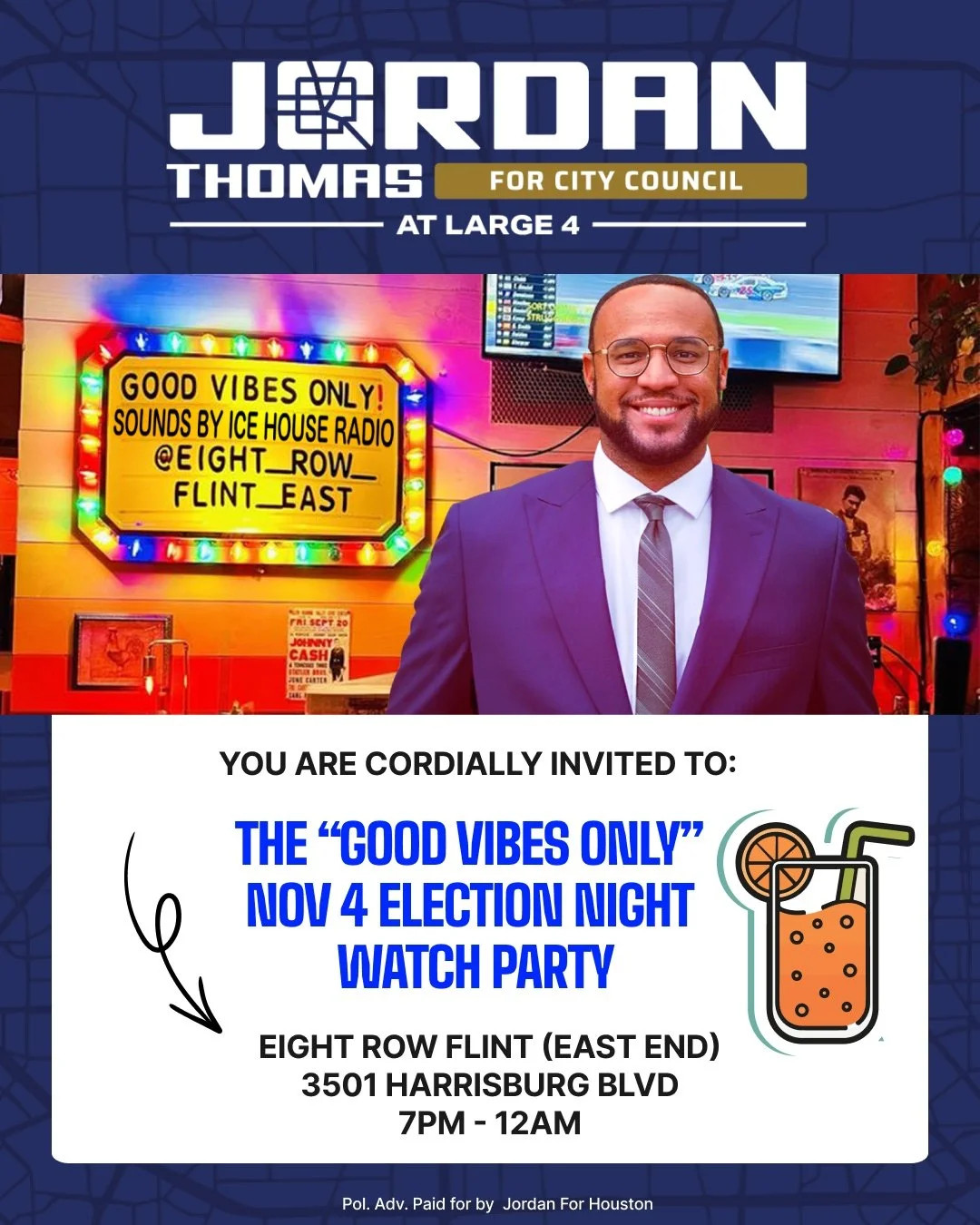 RSVP: Election Night with Jordan Thomas – November 4th! Eight Row Flint (East End) 3501 Harrisburg Blvd | 7pm-12am FREE RSVP BELOW Name * First Name Last Name Email * Phone (###) ### ####